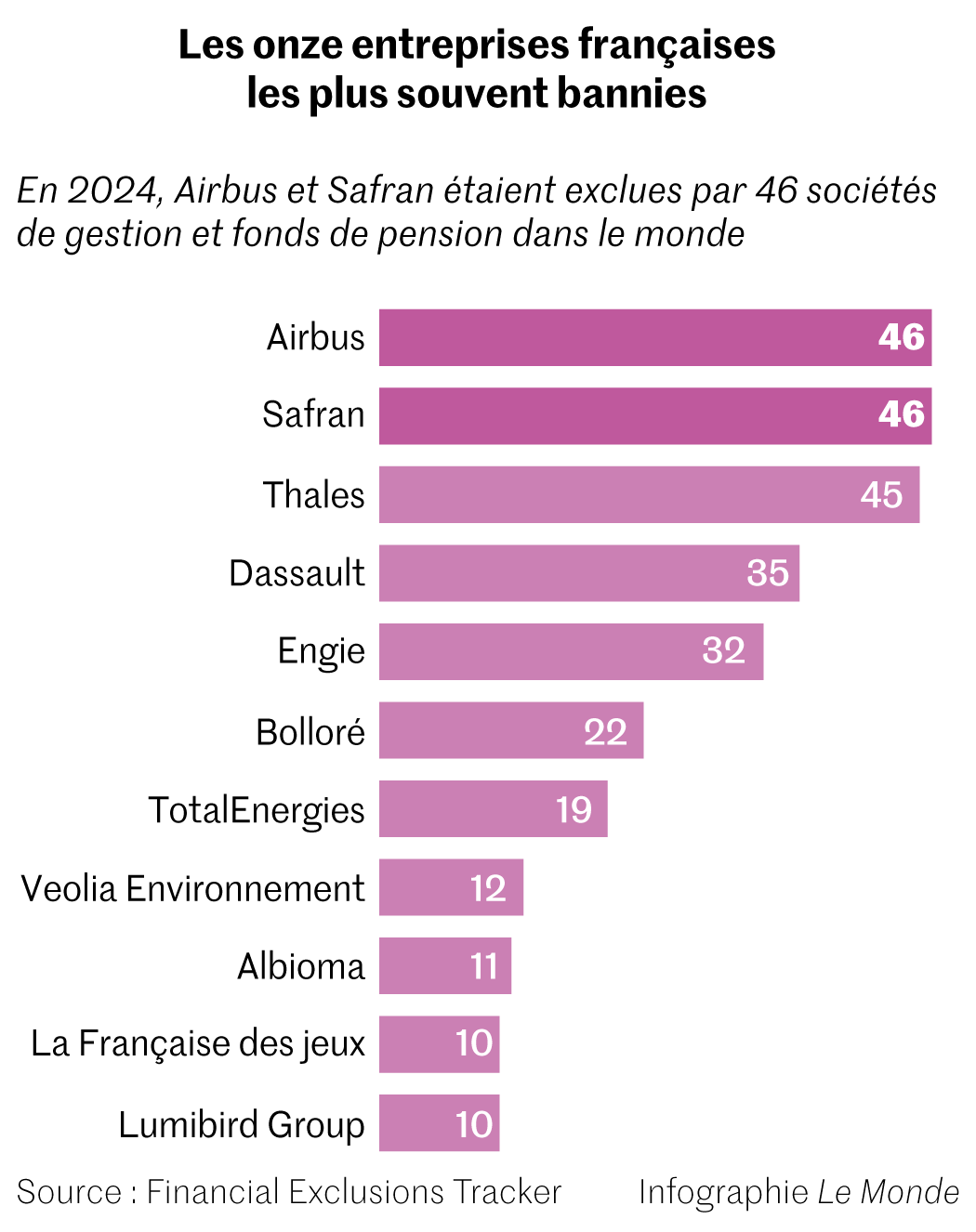 Les premiers groupes hexagonaux – Airbus,Safran et Thales – arrivent à partir de la 57e place du classement mondial,rejetés par plus de 40 grands investisseurs. Des fleurons boycottés,comme une majorité de firmes nationales,en raison de leur implication dans l’armement,nucléaire en particulier.