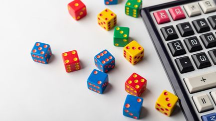 Des dés colorés éparpillés autour d'une calculatrice. Photo d'illustration (Muhammad Aqib / Moment RF / Getty Images)