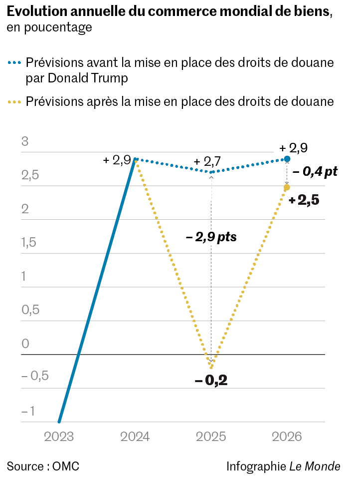 Le choc est d’une telle ampleur qu’il est difficile à mesurer. Dans ses prévisions annuelles publiées ce mercredi 16 avril,l’Organisation mondiale du commerce (OMC) table sur une baisse du volume du commerce mondial de marchandises comprise entre 0,2 % et 1,5 % en 2025 en fonction de la politique douanière de Trump,soit une baisse d’au moins 2,9 points de pourcentage par rapport à ses estimations d’octobre 2024 qui envisageaient une hausse de 2,7 %.